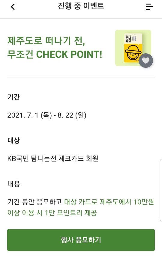 올해 8월 22일까지 국민카드 이벤트를 응모하고