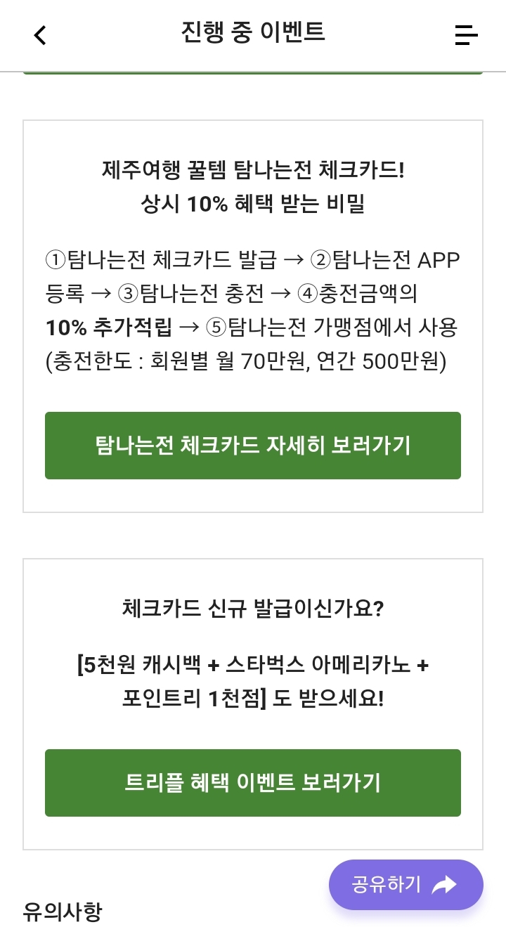 - 혜택 제공시 탐나는전 체크카드가 없으면 이벤트 대상에서 제외된다고 하니 주의하세요