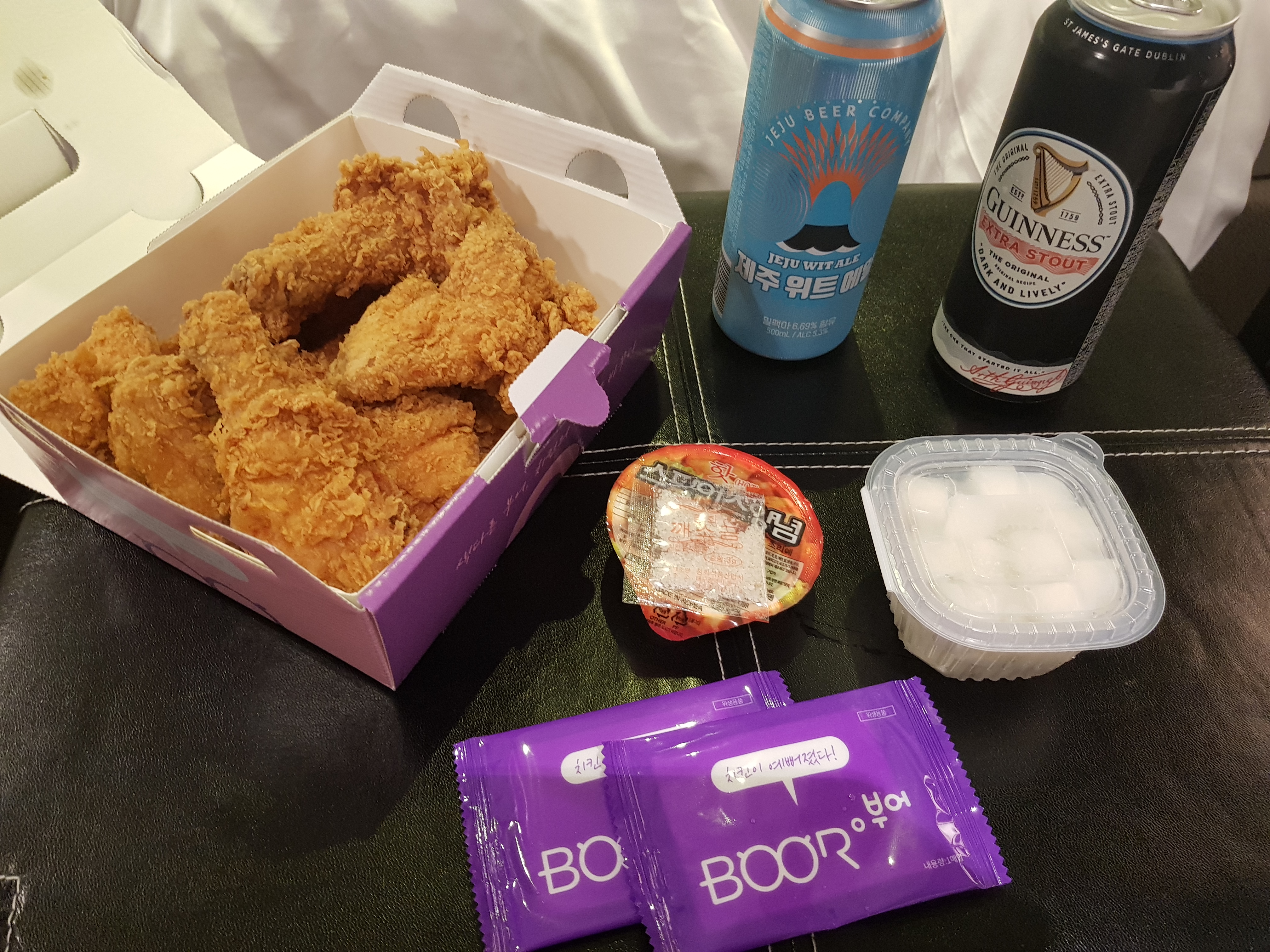 부어치킨 신제주점에서 포장 천원 할인을 받아 크리스피 치킨을 포장하고 편의점 맥주를 사들고 여행 첫날의 설렘을 치맥과 함께 했답니다.