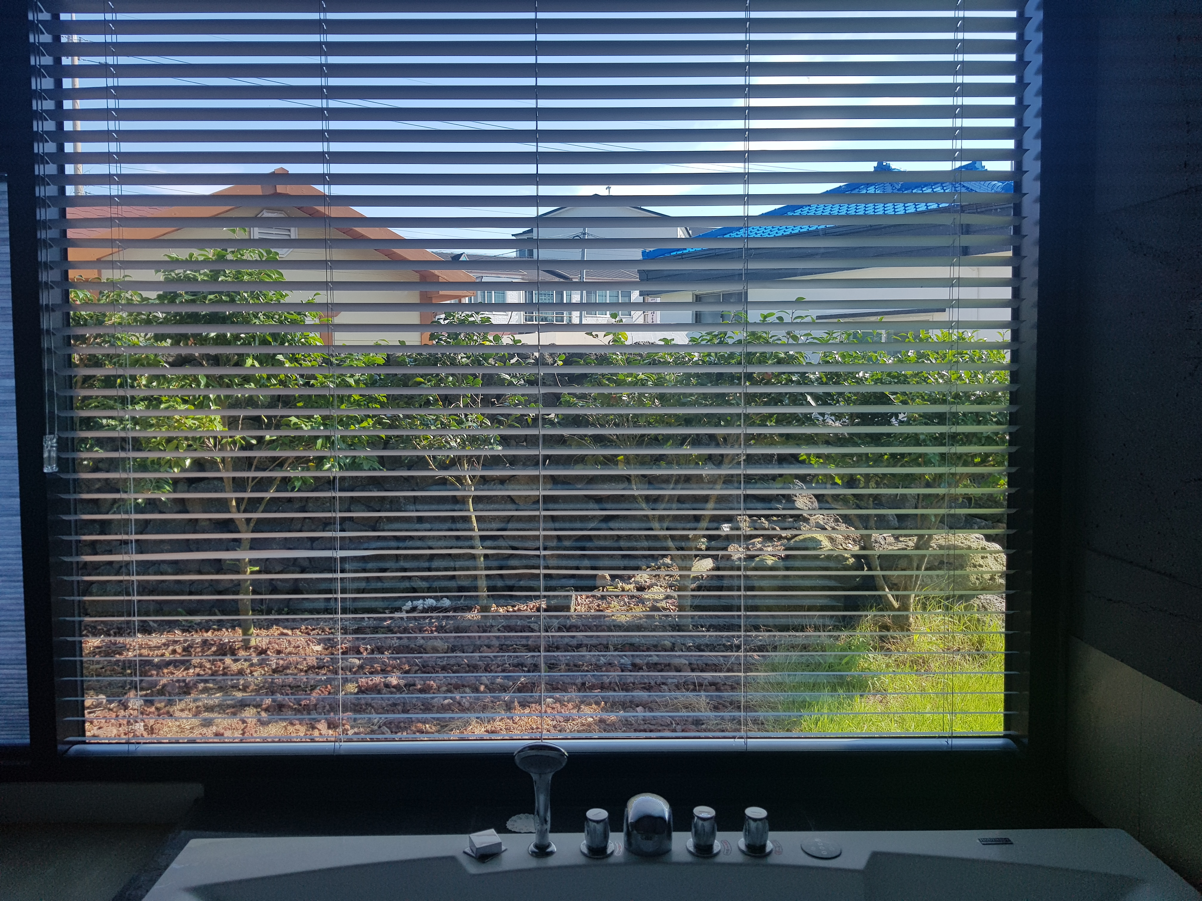 낮에 이렇게 창문넘어로 제주도의 돌담이 보여요.