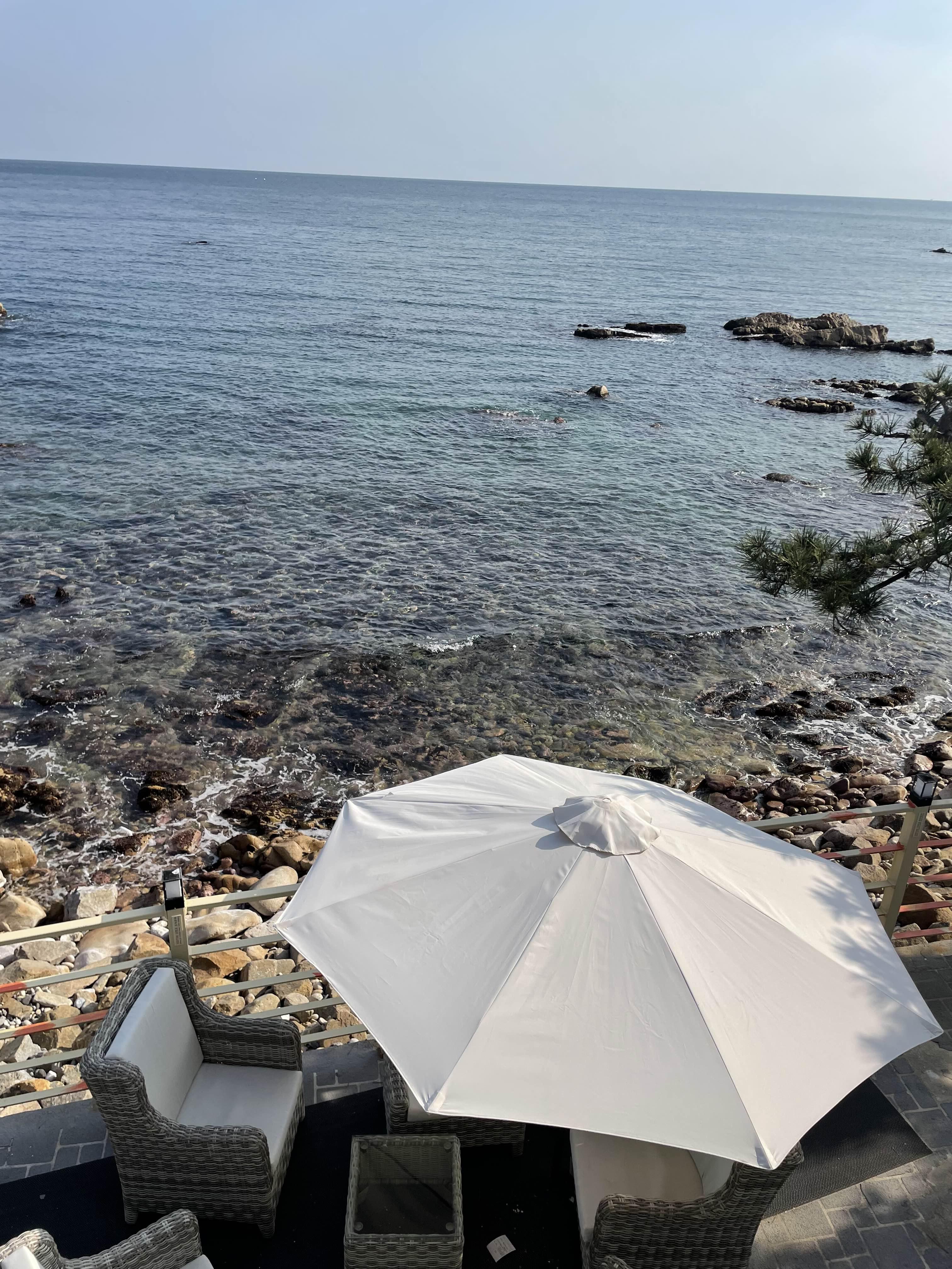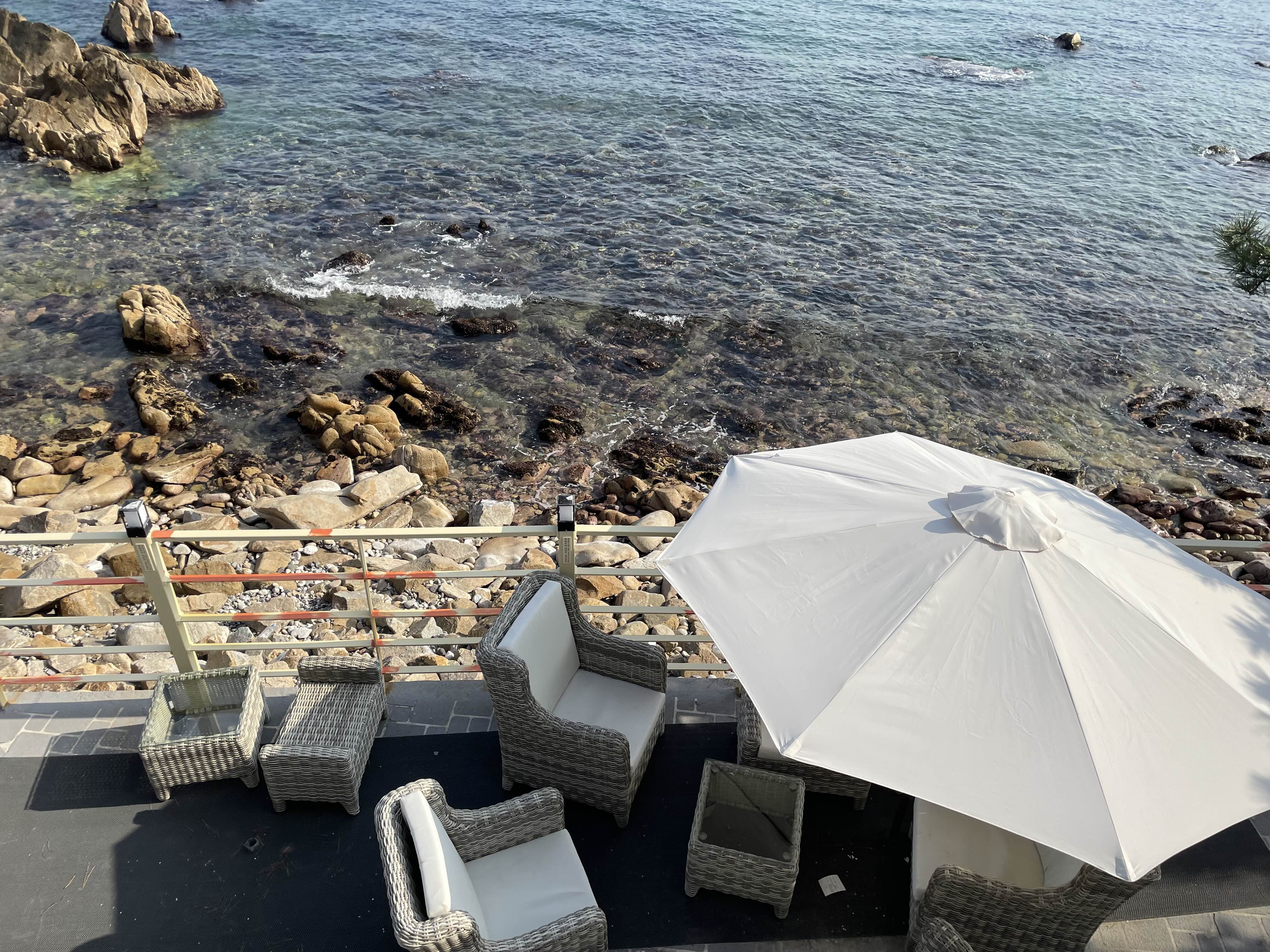 여기는 카페 쪽 실내로 돌아가며 카페 쪽 야외 테라스 자리를 찍어봤는데요. 자리 하나하나가 오션 뷰를 제대로 느낄 수 있게 설계되어 있어 정말 좋은 거 같아요. 확실히 이 구역은 손님들이 많더라고요. 좀 더 안쪽으로 이동하면 여기보다는 여유롭게 이용할 수 있으니 참고해 주세요.