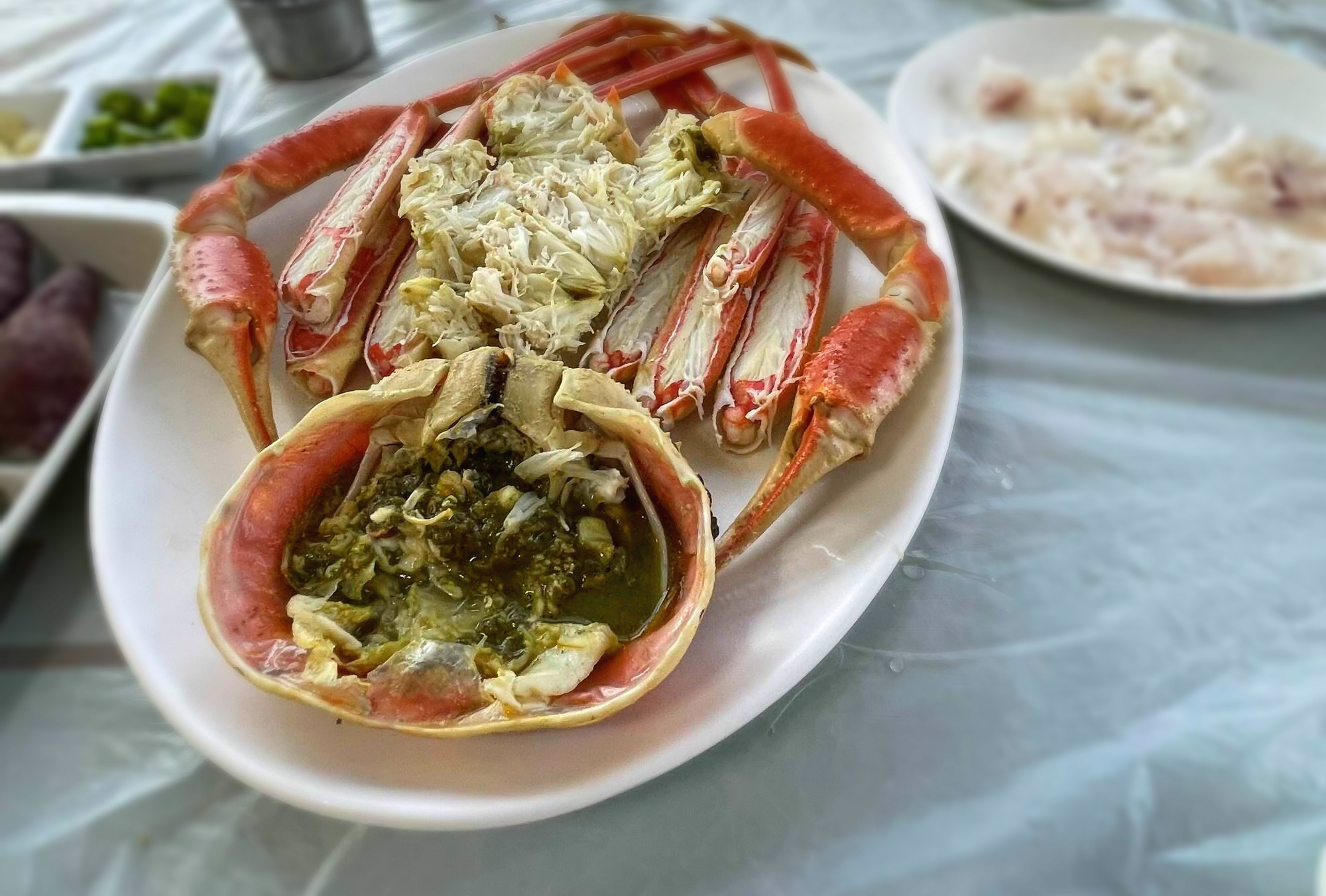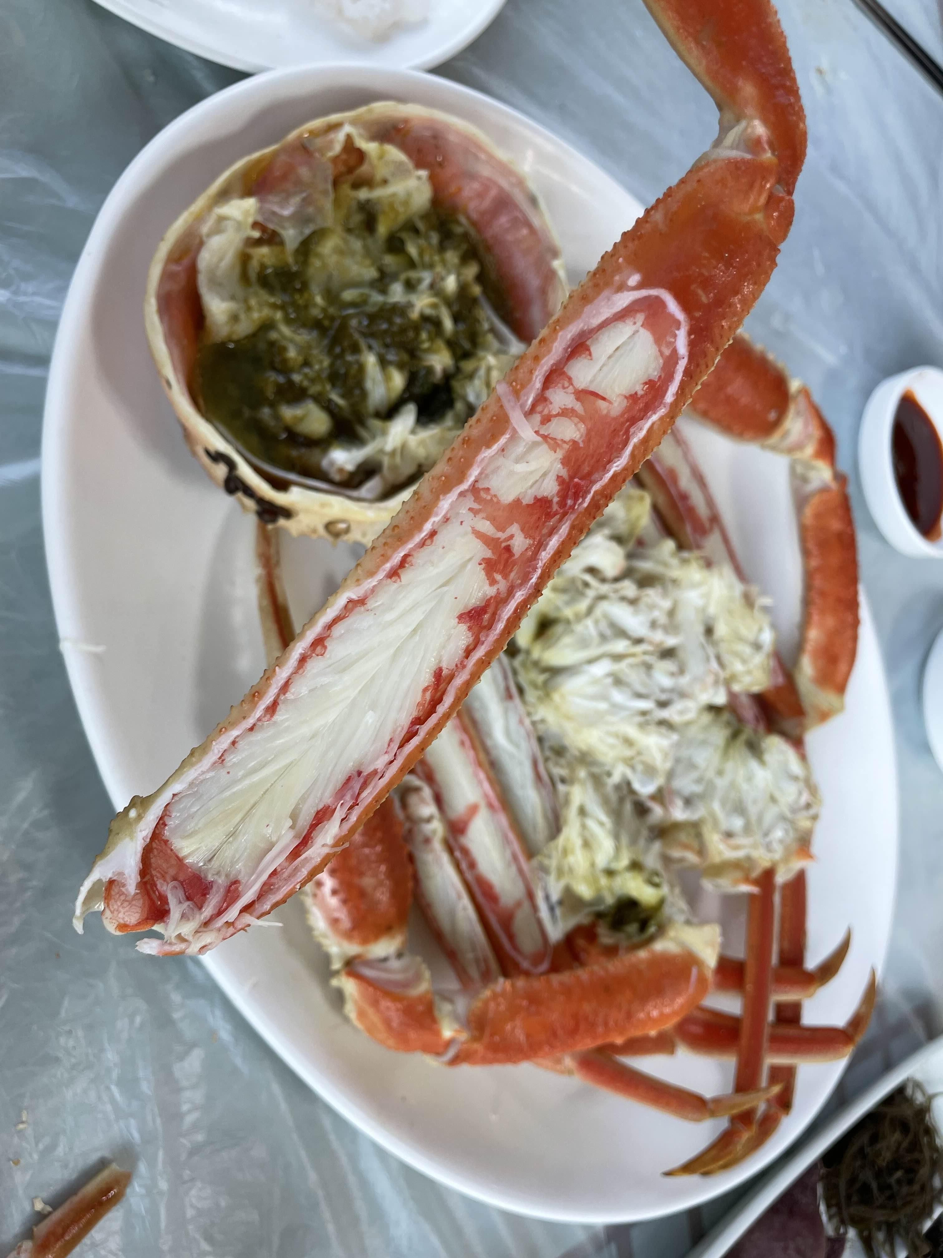 신선한 회를 먹으며 좀 더 기다리니 대게를 쪄서 이모님이 가져다주셨어요. 대게철이라더니 대게 살이 꽉 찬 대게를 보고 정말 놀랐답니다. 대게 수율이 이렇게나 좋을 수가 있다니요. 살이 정말 꽉 차서 한 마리로 둘이서 충분히 먹겠더라고요.