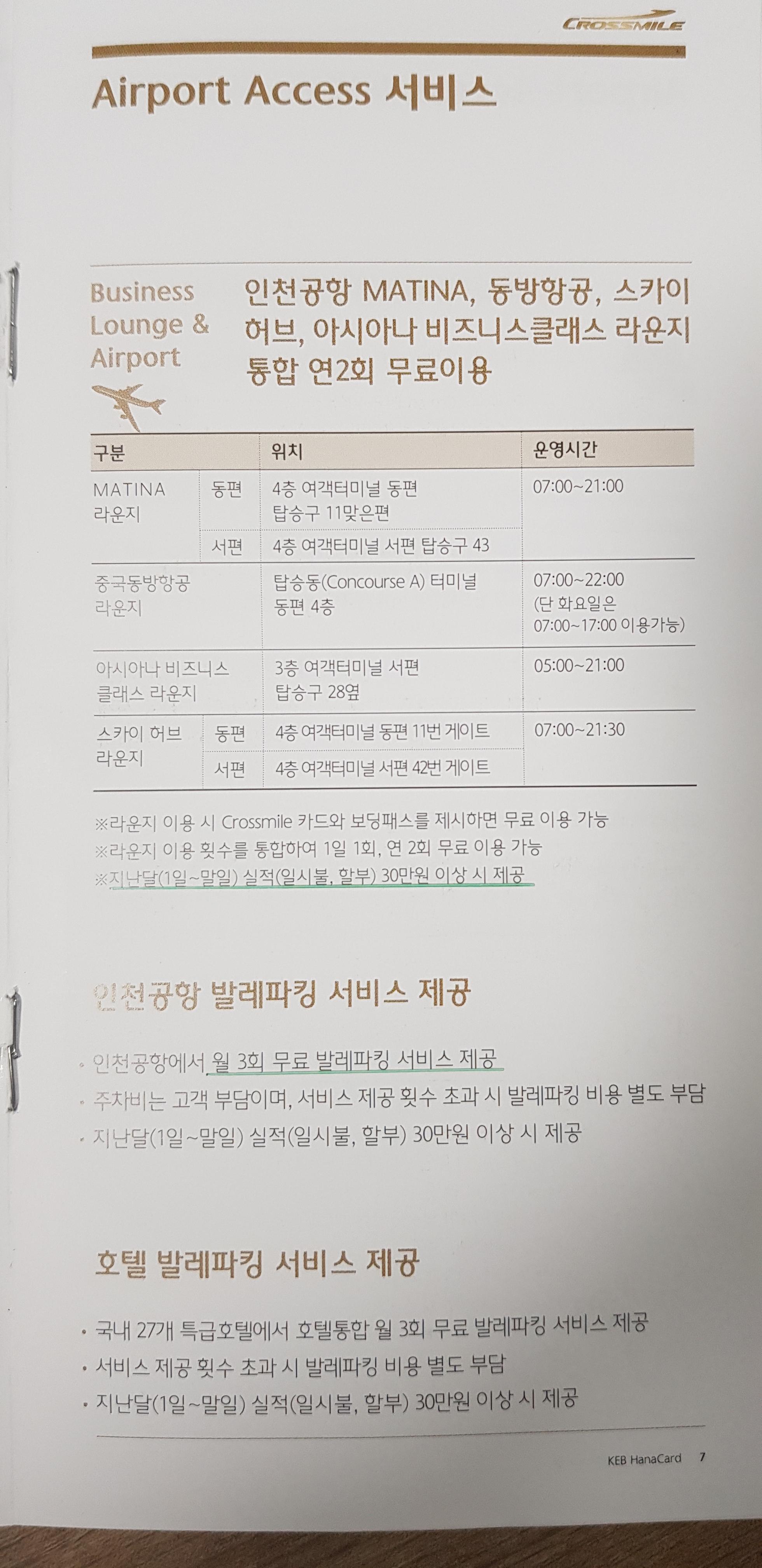 인천공항 라운지 일 1회, 연 2회 크로스마일 실물 카드 제시 후 입장 가능
