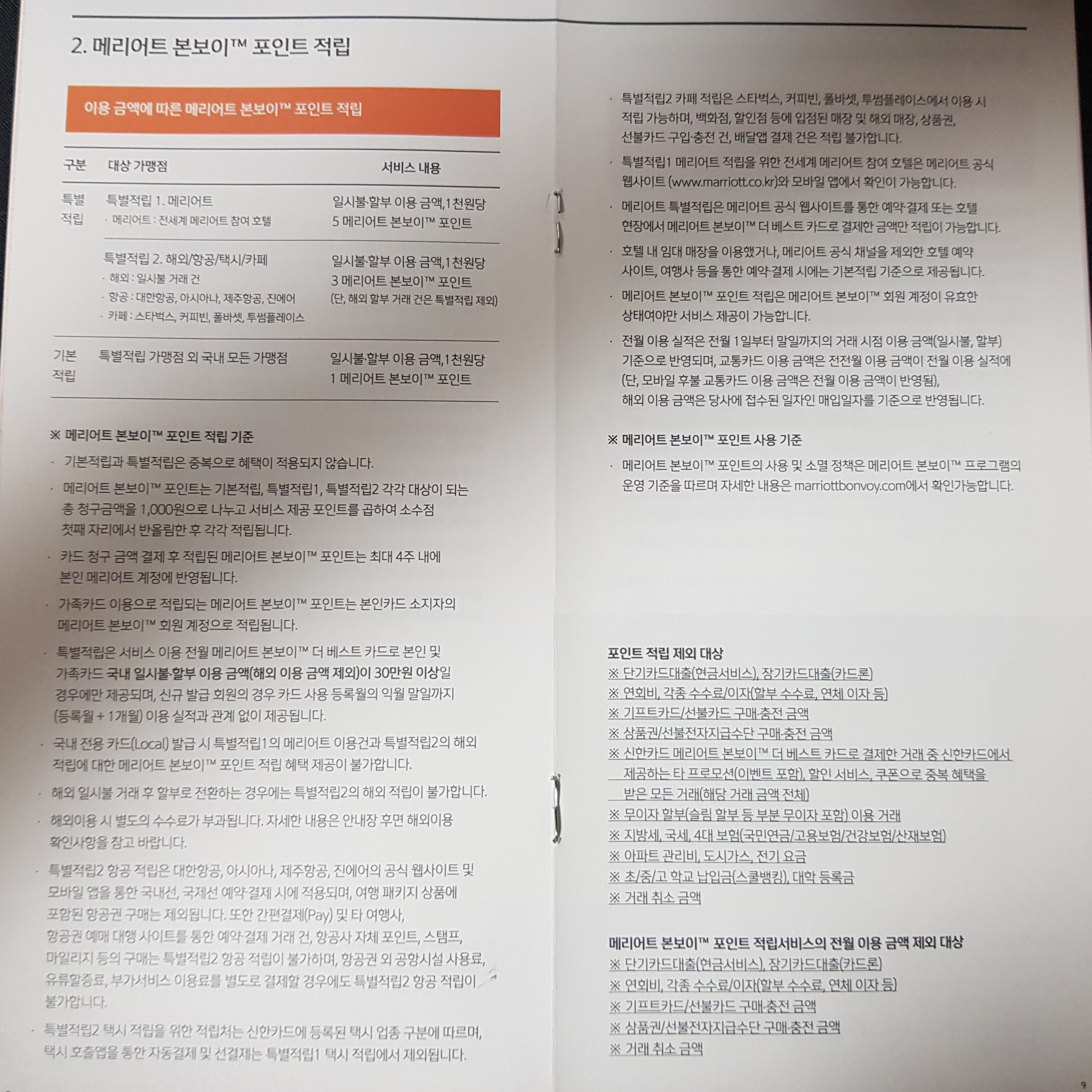 | 특별적립 2 | 해외/항공/택시/카페 일시불,할부 1천원당 3메리어트 포인트 (단 해외 할부 거래 특별적립 제외) |
