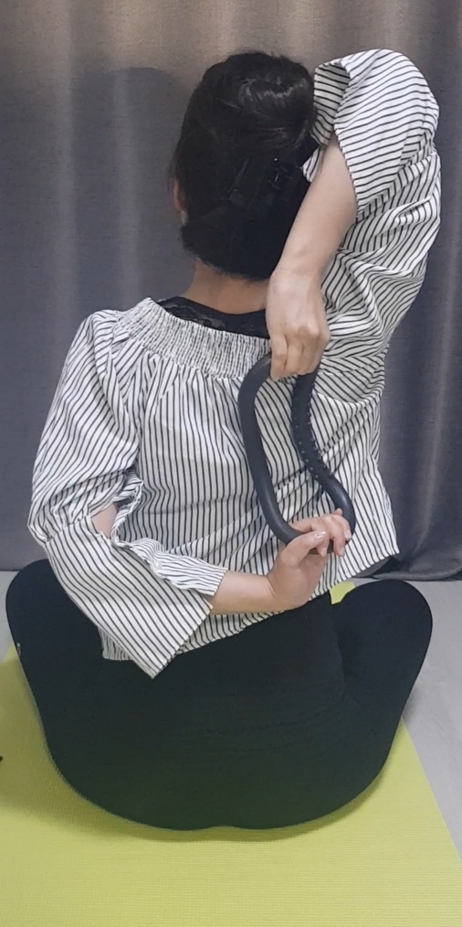 요가링을 등 뒤로 위치시켜 양손으로 잡고 허리를 바르게 편 후 천천히 당겨줍니다.